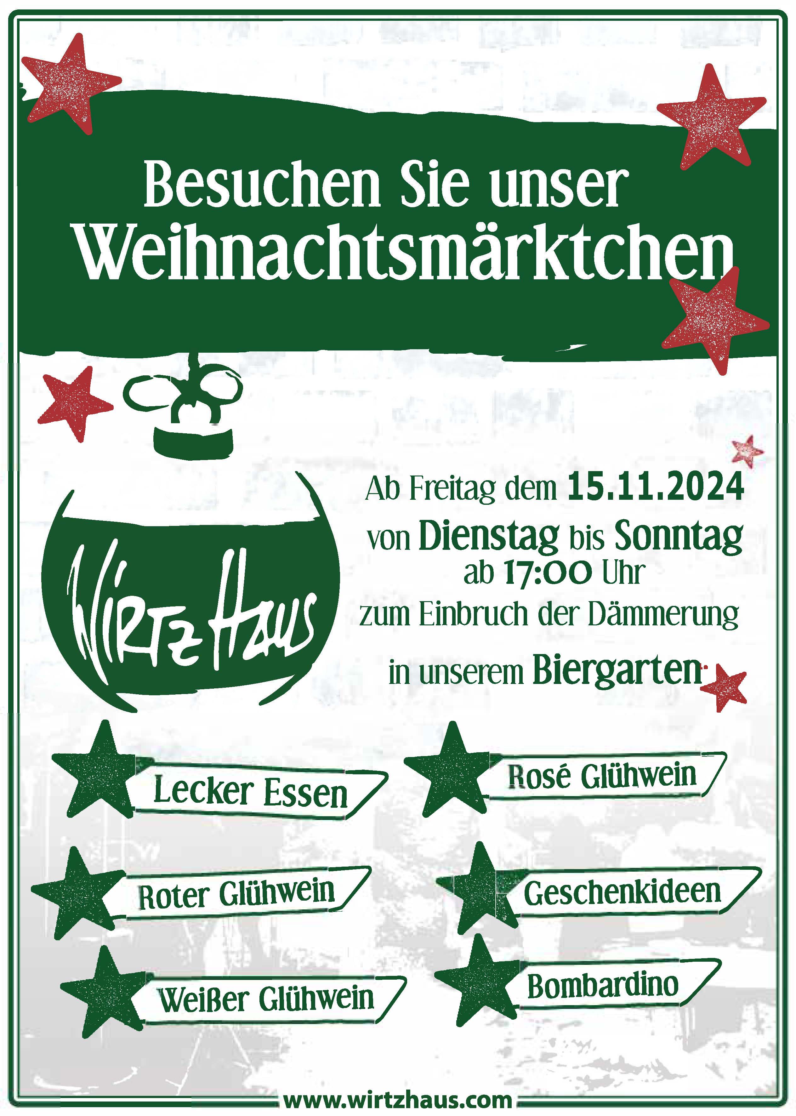 Ab dem 15.11.2024 ist unser Weihnachtsmärktchen wieder geöffnet und bringt bei Glühwein, Spießbraten weihnachtliche Stimmung in unseren Biergarten!